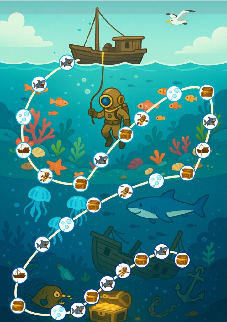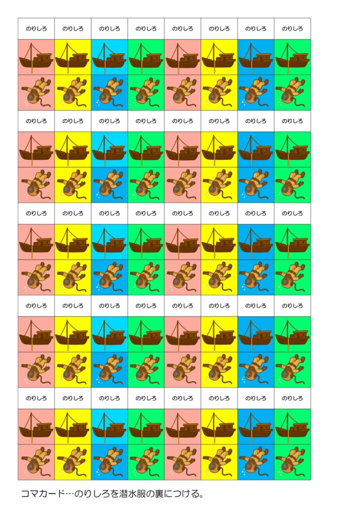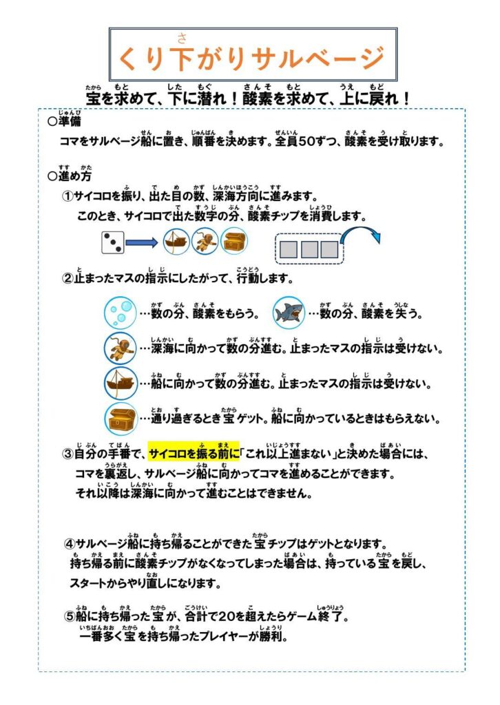 くり下がりサルベージ|小学生-算数|2年生-足し算-引き算-ゲーム くり下がりサルベージ 2年生 足し算 引き算 ゲーム 海の底に沈んだお宝を目指し、限られた酸素を消費しながらサルベージしていくゲームです。最初に持っている酸素が潜るごとに減っていく中で、くり下がりの操作を具体物で体感することができます。※工作用紙を切ったりしたチップが必要です。 ルール ゲーム盤 コマ