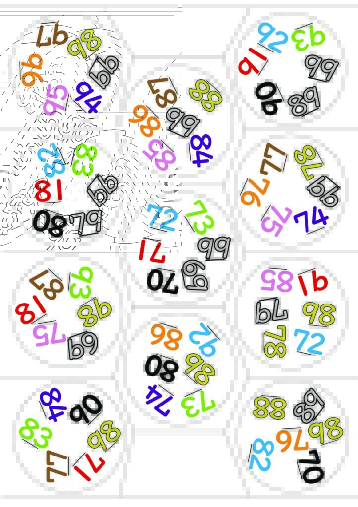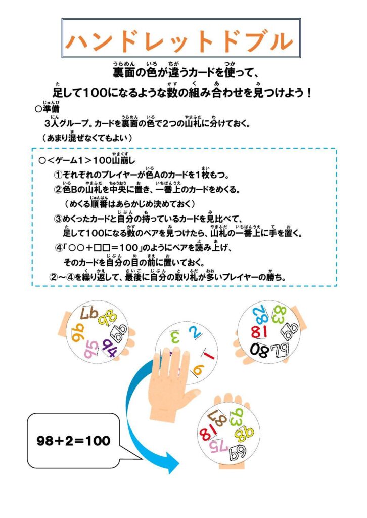 ハンドレットドブル|小学生-算数|2年生-足し算-ゲーム ハンドレットドブル 2年生 足し算 ゲーム どの2枚のカードを組み合わせても必ず1つだけ同じマークが描かれていることが特徴の「ドブル」を算数アレンジしたゲームです。カードAとカードBでは、どの2枚のカードを組み合わせても、必ずひとつ、足して100になる数字のペアがあります。そのペアを誰よりも早く見つけ出す、観察力と反射神経が試されるスピードゲームです。 ルール カードA カードB カードC カードD